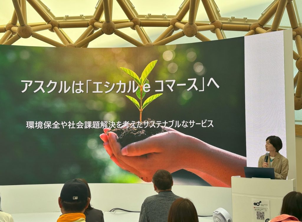 続いて当社アスクルから四夷麻子さんが登壇。対馬市とSDGs連携協定を結んで以来、社員や取引先メーカーと一緒に現地を訪れるスタディツアーを続けてきました。海洋ごみを自分の手で拾う体験を通じて、参加者の意識は大きく変わります。その気づきが、海洋プラスチックを配合したバスケットや大型ごみ箱の商品開発、売上の一部を寄付する取り組みへとつながってきたことを報告しました。