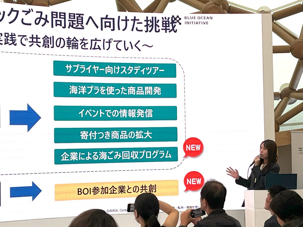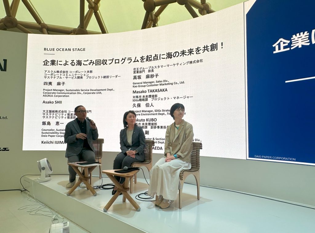 9月16日(火)、2025 大阪・関西万博「BLUE CHALLENGE 2025」の2日目に、「海洋プラスチックごみの回収・再資源化の加速」をテーマとした講演が行われました。会場は一般来場者の方も自由に参加できるオープンなスタイルで、アスクルはクロージングセッションにbuoy株式会社、TOPPAN株式会社とともに登壇しました。