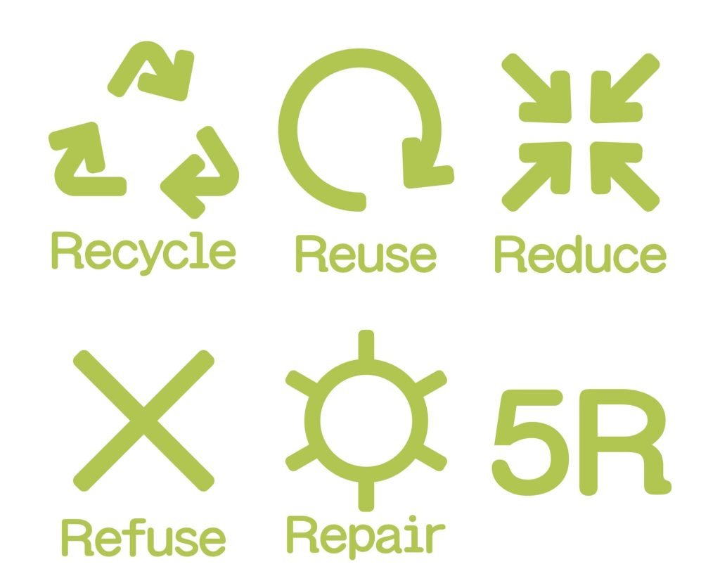 リデュース・リユース・リサイクルの頭文字をとった「3R」は広く定着しつつありますが、近年では、さらに2つの「R」を加えた「5R」がごみを減らす基本的な考え方として注目されています。5つの「R」の意味は、以下の通りです。